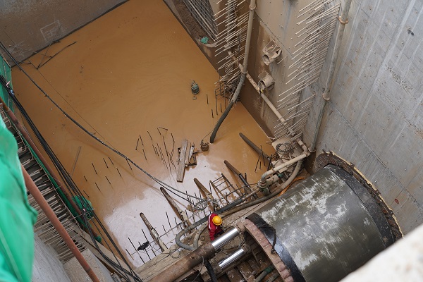 施工現(xiàn)場機(jī)器轟鳴,說話需要提高分貝。一進(jìn)入施工現(xiàn)場,就看到前方有一個(gè)沉井,沉井20米深、13.4*7.3米間方,這個(gè)沉井是挖掘井,在河的對岸還有一個(gè)深15.5米的接收井。從沉井圍欄邊看井底,下邊的工作人員都顯得特別的渺小,20米深的井相當(dāng)于6層樓高,恐高的人都不敢往下看。