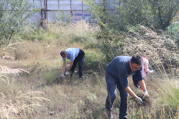 活動中,大家在張永同志的帶領下進行地毯式清除,大家戴手套、口罩、全副武裝,采取連根拔出和收割的方式徹底消除蒿粉傳播漂浮,切斷蒿粉過敏原并將拔出的蒿草及時清運,以免草籽散落再次生長。